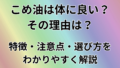 関連記事:こめ油は体に良いと言われるのはなぜ?特徴・注意点・選び方をわかりやすく解説